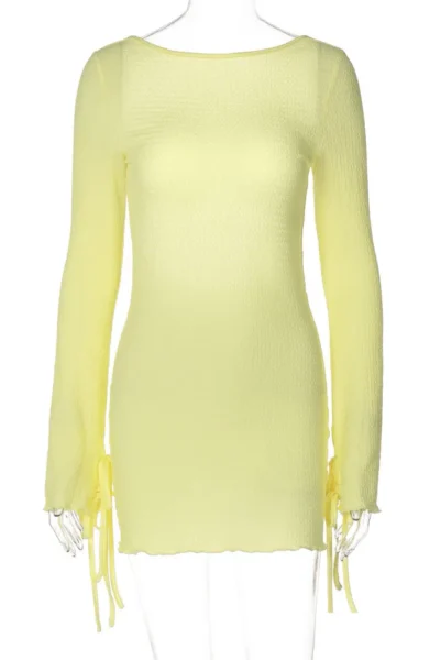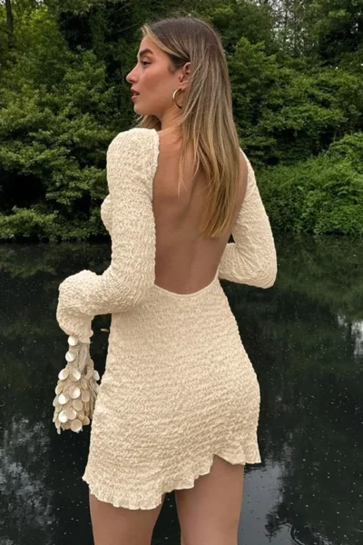 Elegant backless crumple long sleeve mini dress for women. A chic, flattering choice for autumn or beachside evenings.