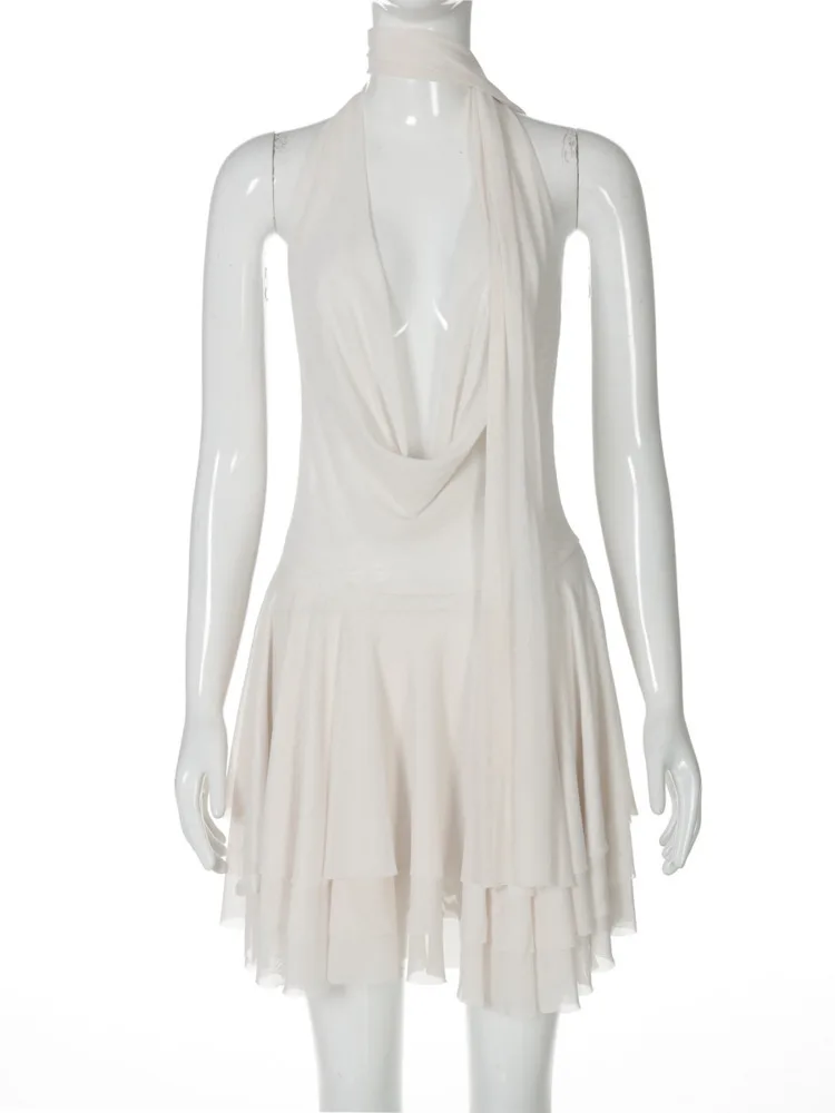 Elegant halter backless mini dress with deep V neck and ruffled skirt. Chic, feminine, and perfect for parties or nights out.