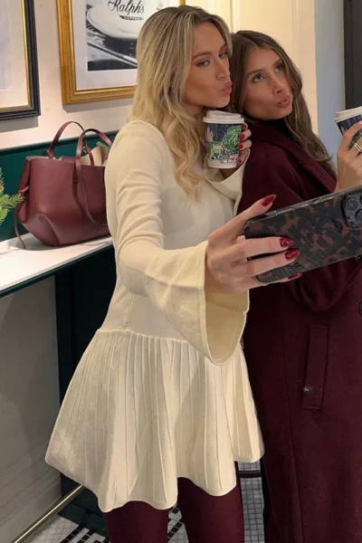 This elegant knit mini dress with a high collar and pleated skirt is the perfect companion for autumn and winter. Thoughtfully designed for women who appreciate understated charm, it brings warmth and poise to any occasion, from casual city strolls to cozy evening gatherings.