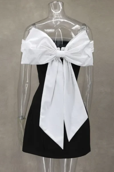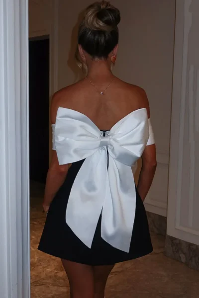 Elegant off-shoulder bow backless mini dress in black & white. Feminine, chic, and perfect for parties or special nights out