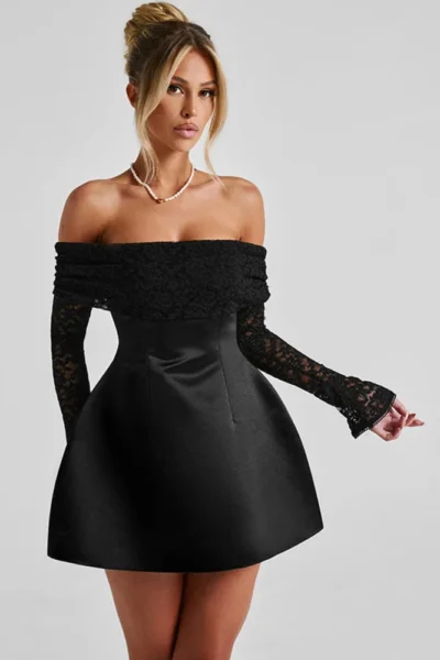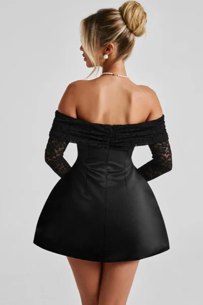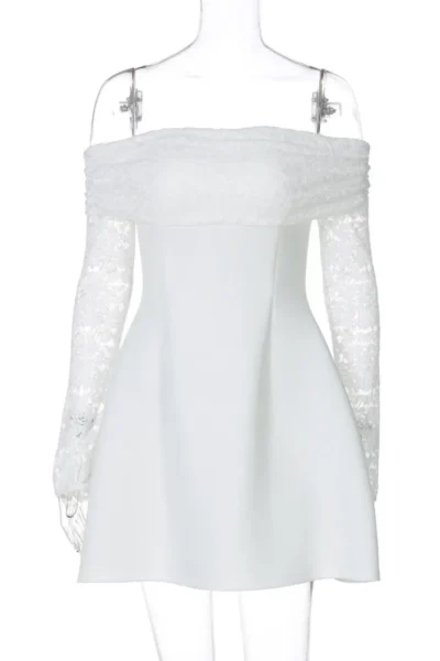 Elegant off-shoulder lace long sleeve mini dress with backless, strapless design and A-line silhouette — perfect for chic evenings.