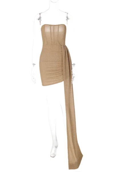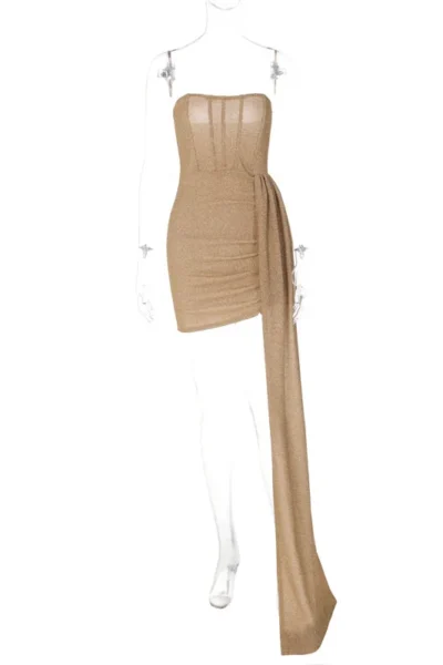 Feel confident and glamorous as the strapless neckline frames your shoulders and collarbones beautifully. The asymmetric draped panel adds dramatic flair, while the ruched bodycon silhouette enhances your curves. Available in gold and black, it’s your go-to dress for making a memorable entrance.