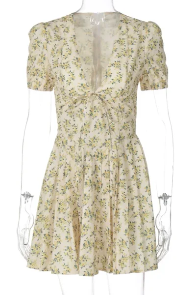 Embrace a romantic and effortlessly graceful look with this floral deep V-neck A-line mini dress, a timeless choice for sunny afternoons, garden parties, or simply feeling lovely on any day. Its soft yellow floral print and feminine silhouette create a light, joyful vibe while remaining refined and flattering.