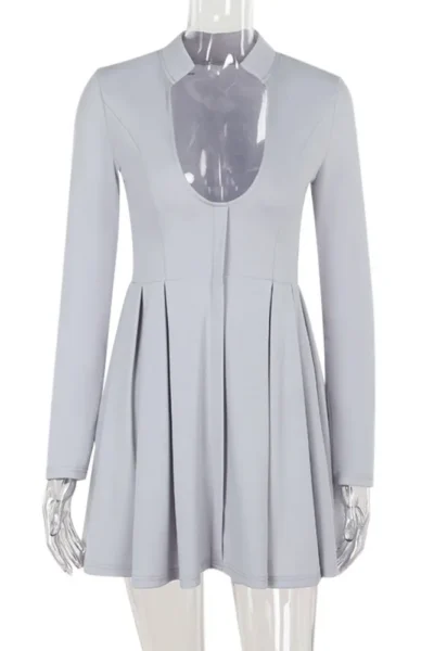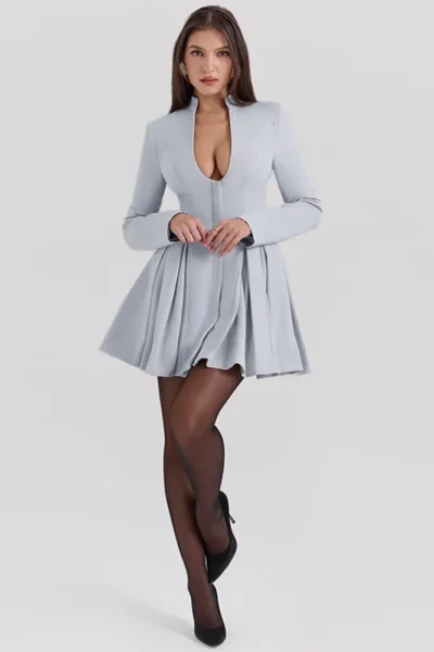 Gray long sleeve V-neck pleated mini dress with high waist A-line fit. A bold, elegant choice for club nights & special events.