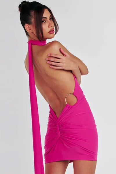 Halter backless pleated mini dress with metal ring and asymmetrical strap. Sleek, bold, and perfect for chic party nights.