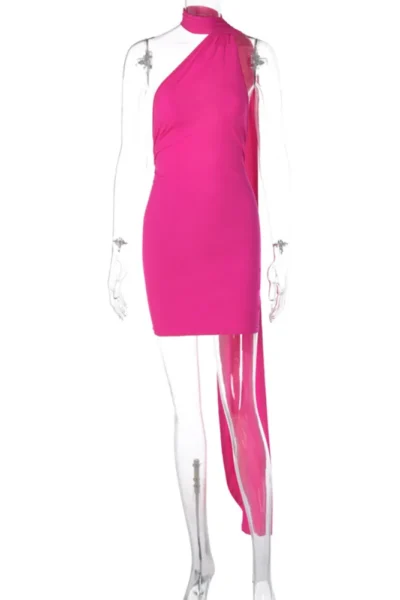 Feel effortlessly sexy and elegant in this one-shoulder halter design that leaves your back beautifully bare. The asymmetrical strap adorned with a metallic ring detail adds a modern edge, while the flattering pleats accentuate your curves. With its bodycon silhouette and mini length, this dress is a guaranteed showstopper.