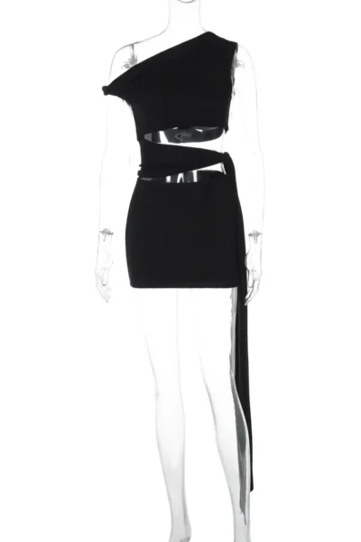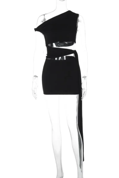 Turn heads and make a dramatic entrance in this hollow out oblique shoulder black mini dress, designed for nights when you want to stand out. Ideal for upscale clubs, glamorous parties, or an unforgettable date night.