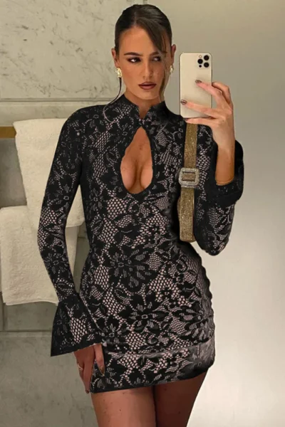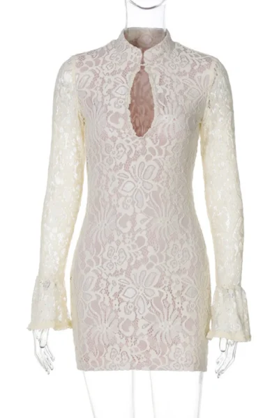 Lace Hollow Out Long Sleeve Mini Dress for Women Club Night