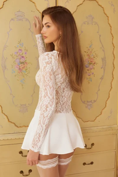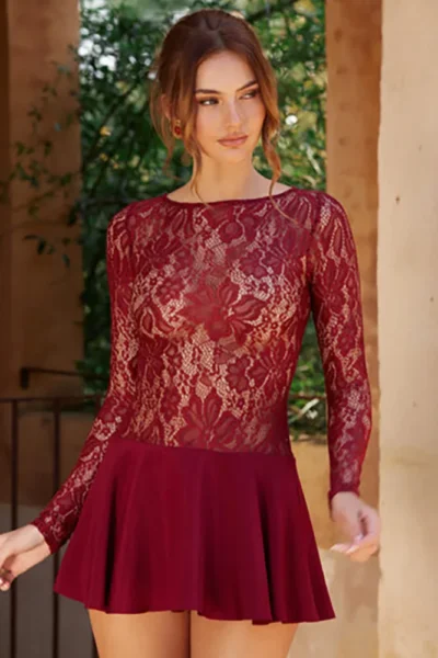 With its sheer lace bodice and A-line skirt, this dress enhances your curves while offering graceful movement. The high waist flatters your shape, and the long lace sleeves add just the right amount of intrigue. It’s a dress that makes you feel sexy yet tasteful all at once.
