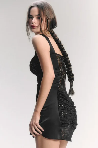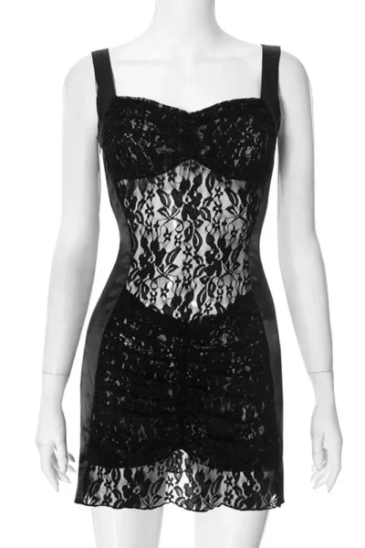 Lace see through mini dress with spaghetti straps, square neckline, and ruched bodycon fit. Bold, chic, and perfect for nights out.