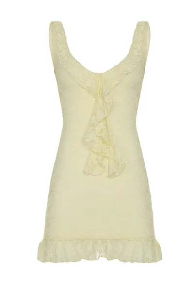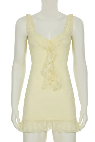 This lace sleeveless ruffle mini dress is made from soft lace fabric with a slight stretch, ensuring both comfort and a flattering fit. Its delicate ruffles and bodycon silhouette create a perfect balance between romantic and modern.