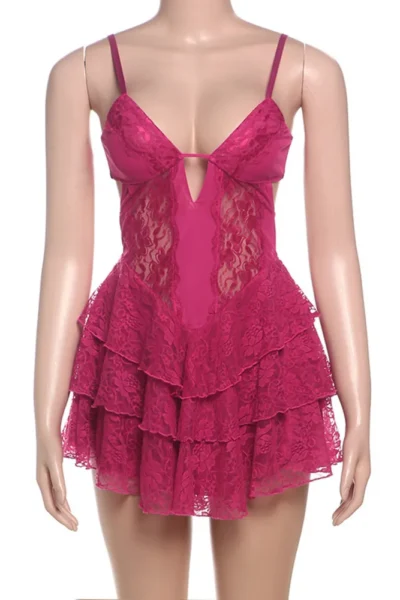 Lace spaghetti strap ruffled backless mini dress with sheer panels and tiered skirt. Feminine and bold for special occasions.