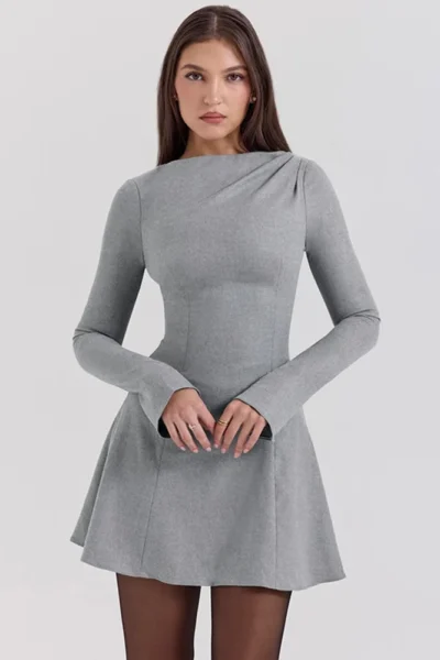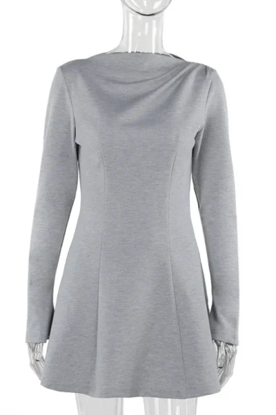 Made with a soft, medium-weight knit fabric, this dress ensures comfort even on cooler nights. Its O-neckline frames the face gracefully and allows for easy accessorizing, while the slightly flared hem adds a touch of movement and playfulness. Available in subtle gray and classic black, it’s easy to pair with heels, boots, or layered outerwear for different looks.
