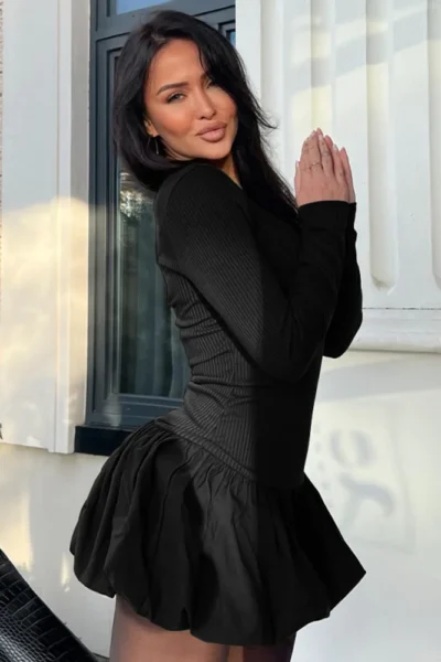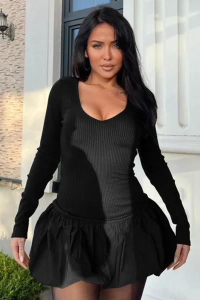 The soft V-neckline subtly frames your décolletage, while the ribbed long sleeves and bodice hug your figure comfortably. Below the high waist, the skirt flares into a dramatic puffball shape with delicate pleats and ruffled edges, creating beautiful movement with every step. This contrast of textures and proportions makes it perfect for chic dinners, holiday parties, or casual elegant outings.