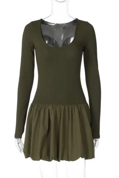 The long sleeve puffball A-line ruffled mini dress is a sophisticated yet playful piece that’s perfect for autumn and winter wardrobes. Designed for women who appreciate unique silhouettes with a feminine edge, this dress combines a slim-fitting ribbed top with a voluminous puffball skirt for a modern, eye-catching look.