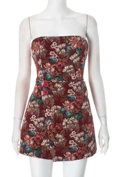 - Features: Strapless neckline, sleeveless cut, backless design, bold floral print, mini length