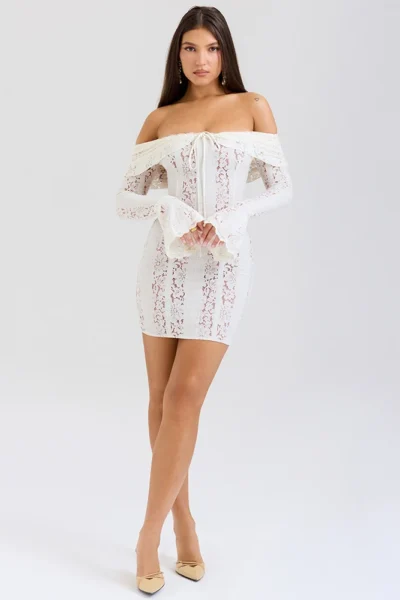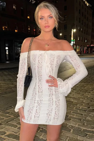 Off-shoulder lace white bodycon mini dress for women. Sexy yet elegant look, perfect for parties, clubs, and romantic nights.