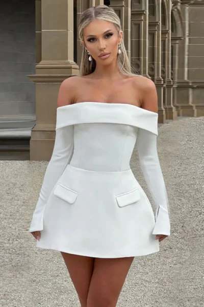 This dress is part of our signature structured collection—where strong lines meet soft curves. The off-shoulder long sleeve mini dress is designed for women who appreciate minimal elegance with maximum impact.