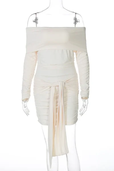 Elegant off-shoulder ruched bodycon mini dress for women. Perfect for chic parties & romantic evenings. Shop now for timeless sophistication.
