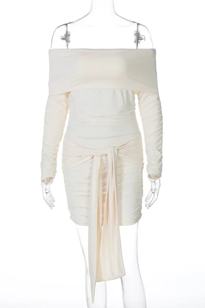 The thoughtful construction includes an off-shoulder neckline, backless cut, ruched bodycon fit, long sleeves, tie waist, and mini hemline. Choose your perfect fit from available sizes S, M, or L, and refer to the size chart for guidance. To keep your dress looking new, hand wash gently and hang to dry — avoid bleach or harsh detergents to preserve the fabric’s integrity and color.