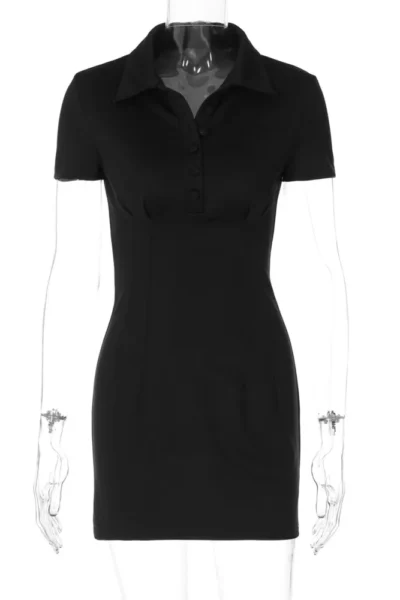 Polo collar bodycon mini dress with buttons and short sleeves. Chic, elegant, and perfect for summer days or casual parties.