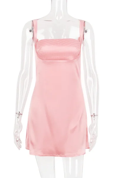 Satin spaghetti strap mini dress with sexy backless design. Perfect sleeveless party dress for chic, confident women.