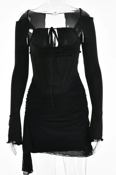 The fitted bodice features structured fishbone seams that sculpt and flatter your waistline beautifully. Delicate spaghetti straps frame the shoulders, while the cut-out neckline and open back lend just the right amount of drama. Sheer long sleeves add a touch of mystery and sophistication, flowing gently at the cuffs for a feminine finish. Every angle of this dress is designed to captivate, making it ideal for upscale parties, club nights, or romantic evenings.