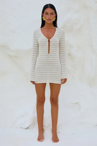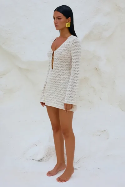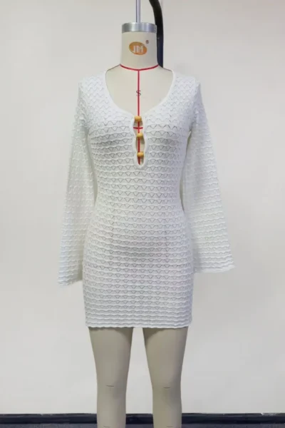 Whether styled over a swimsuit or paired with minimal underlayers, this white hollow out deep v neck long sleeve knit dress transitions easily from beach to bar. A must-have for women who love understated elegance.