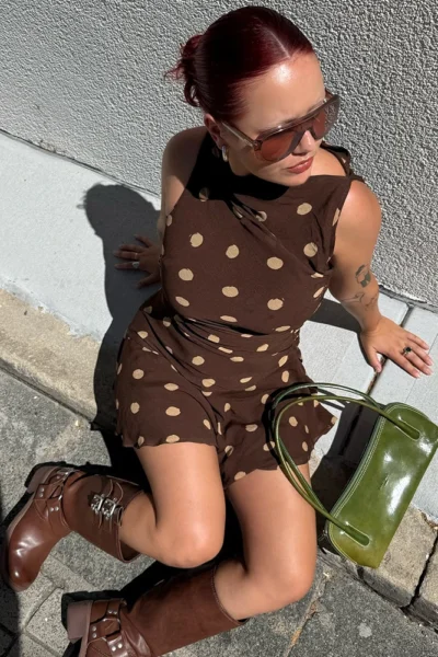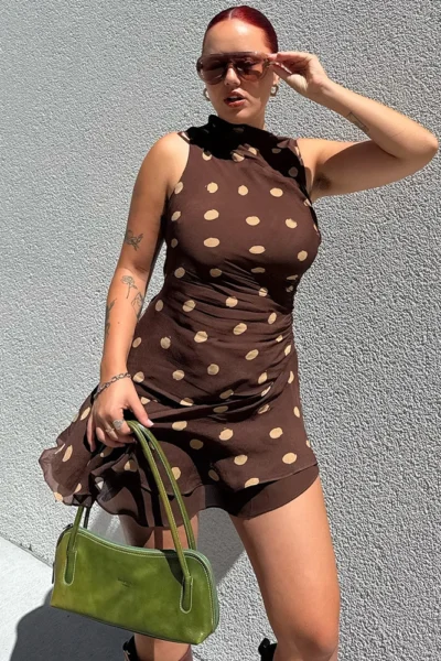 Playful yet elegant, this sleeveless polka dot mini dress for women brings a touch of vintage-inspired charm to your modern wardrobe. With its flattering fit, ruched detail, and irregular hemline, it’s a versatile piece perfect for brunch, date nights, or summer events.