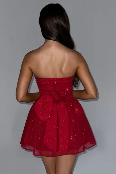 Confident, radiant, and ready to party — this strapless sparkle mesh mini dress with bow is a show-stopping addition to your evening wardrobe. Style it with statement earrings, strappy heels, and a bold lip for a glamorous finish. Discover more party dresses to complement your look, and explore this fashion article for tips on how to accessorize your mini dress for any event.