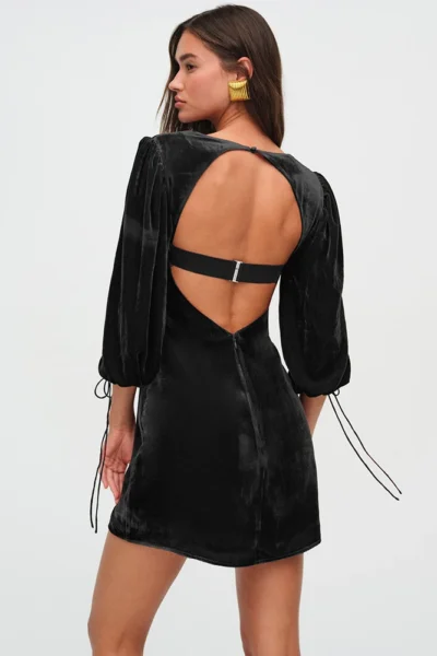 Pair this velvet square neck backless half sleeve bodycon mini dress with statement earrings, heels, and a clutch for a polished, head-turning outfit. Discover more evening dresses here and explore Vogue’s winter party trends.