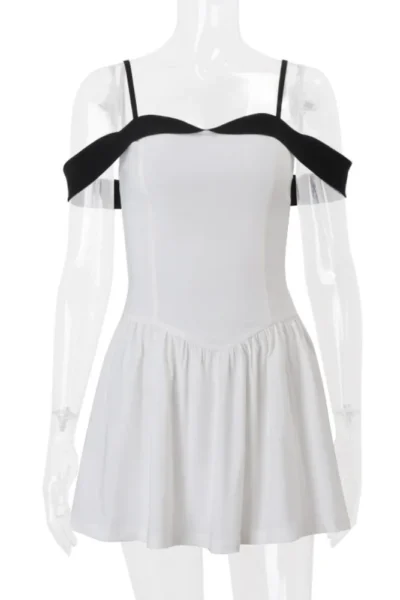 The flattering A-line cut creates a graceful, twirl-worthy skirt, while the fitted bodice with delicate spaghetti straps highlights your shoulders beautifully. The off-shoulder black panel detail adds a chic contrast to the crisp white fabric, making the look both eye-catching and refined.