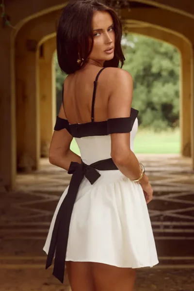 Step into effortless charm with this white and black off-shoulder A-line mini dress, a perfect blend of classic elegance and contemporary flair. Designed for stylish evenings, garden parties, or romantic dinners, this dress exudes sophistication while remaining playful and light.